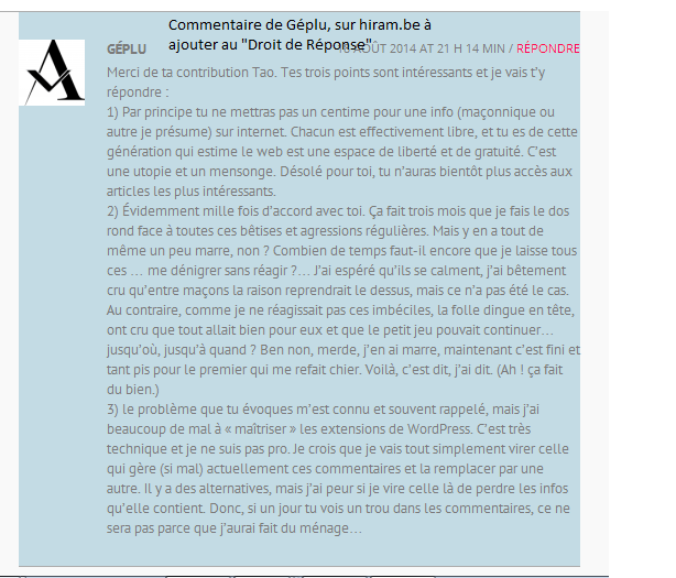 Suite à l'article parue le 18 avril 2014 portant le titre de « Drôles de comportements » ici : http://www.hiram.be/droles-de-comportements/, signé sous le pseudonyme Géplu, de Monsieur Gérard Plumecocq, en qualité de Rédacteur Principal, pour la société « les Editions du Delta Lumineux SNC au capital de 1000 €, située à Saint-Saulve (59), représentée par Nathalie Dottel, son Directeur de Publication, et suivant la loi sur la liberté de la presse en date du 29 juillet 1881, article 13, je demande en l'espèce un droit de réponse à publier dans le délai prescrit par la loi sur le blog appartenant aux « Editions du Delta Lumineux SNC » connu sous le nom de « hiram.be » (adresse : http://www.hiram.be/)