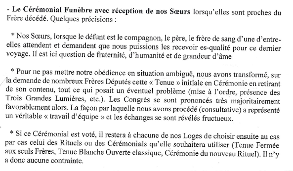 C'est le deuxième point qui a retenu toute mon intention. Les loges auront le choix entre une « tenue funèbre » préservant le « entre hommes », une tenue blanche fermée permettant d'accueillir des profanes et pour les sœurs qui persisteraient à vouloir porter leurs décors, ce sera la p'tite cérémonie profane … pour laquelle, afin d'éviter toute ambiguïté, il fut retiré « tout ce qui causait problème ». C'est vrai que les sœurs ne pourraient supporter de se mettre à l'ordre ou de voir une bible sur un autel …