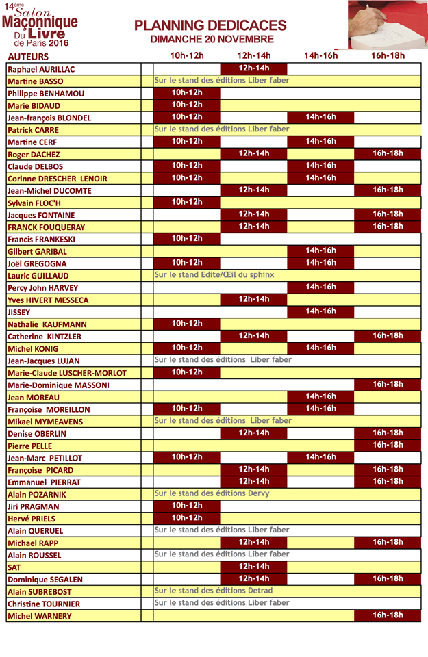 Pour vous aider, le Salon Maçonnique du Livre a prévu un "planning de dédicaces" pour samedi 19 et dimanche 20 novembre ... que j'ai le plaisir de vous transmettre.