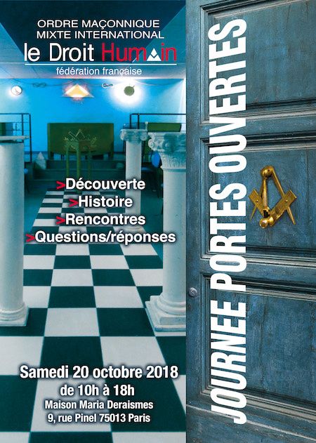 En effet, la Fédération Française du Droit Humain a décidé d'organiser une Journée "Portes Ouvertes" ce 20 octobre 2018 de 10 heures à 18 heures.