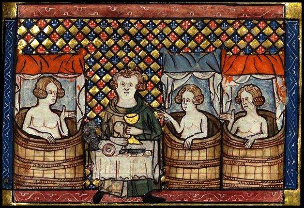 Jusqu'au 14ème siècle, il existait des bains et étuves publiques, qui furent interdites par l'Eglise Catholique, sous le prétexte qu'ils étaient des lieux de débauche et des réservoirs à peste. Ainsi, à partir de la Renaissance, l'eau : les bains et les ablutions furent prohibés. Les gens étaient sales, malodorants, et utilisaient des cosmétiques qui les tuaient plus qu'autre chose. Il faudra attendre le 18ème siècle pour que réapparaissent les bains publics, les baignoires individuelles et des pratiques d'hygiène (se laver tout simplement) que nous connaissons.