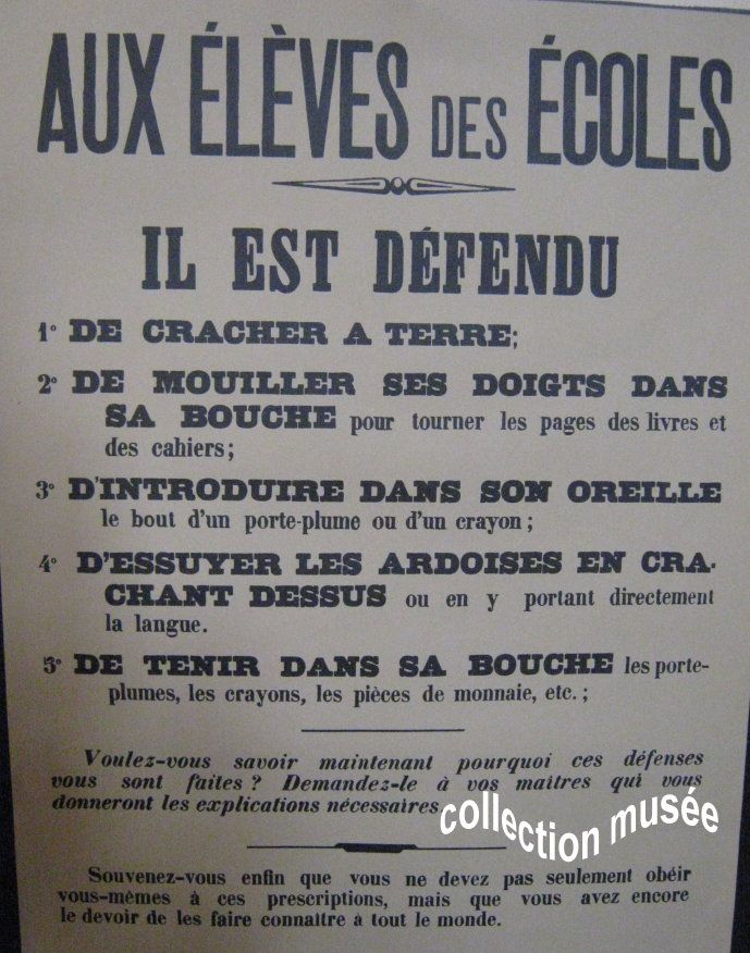Une première circulaire ministérielle de 1902 – complètement liberticide et affreusement hygiéniste – apprends aux enfants qu'il est interdit de cracher dans la rue. Une campagne contre le crachat dans la rue est durement menée.